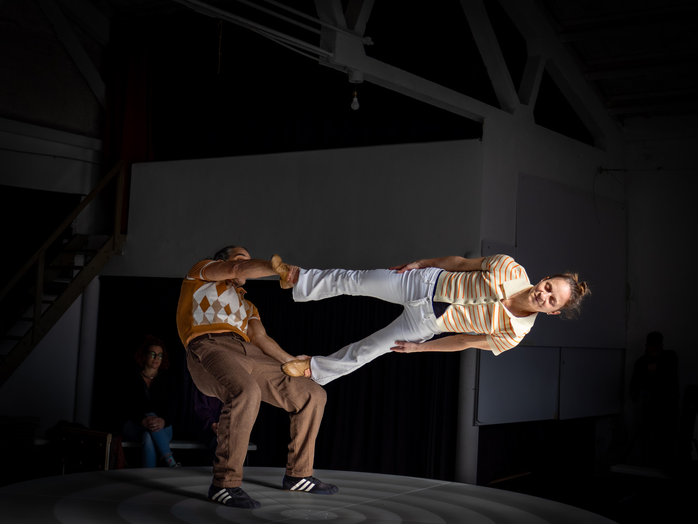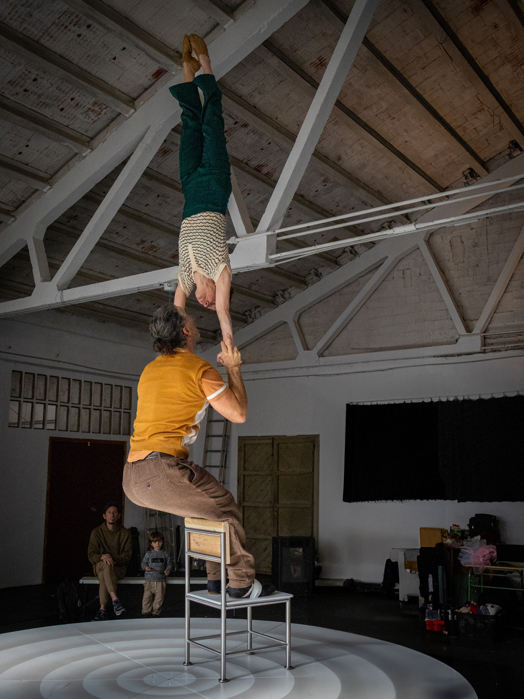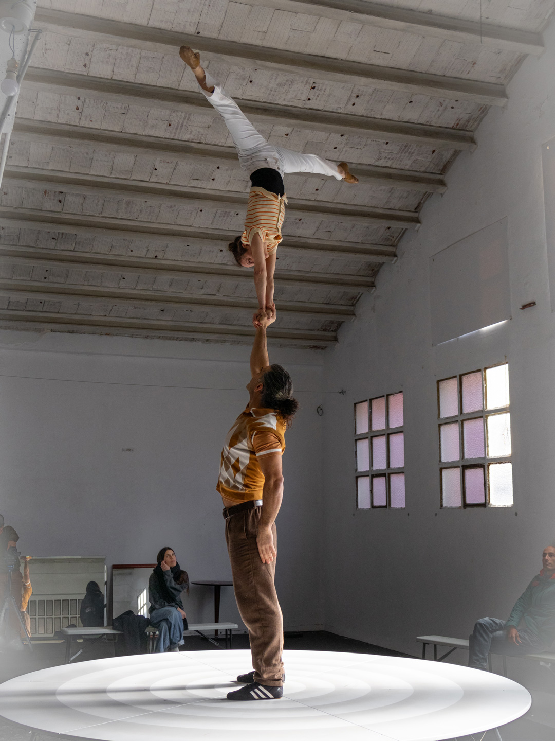A rotating platform, conceived as a scenic space, is the setting from which we share our experiences in their various dimensions: the professional couple (as acrobats and artists), conjugal life, and the family environment. With the audience positioned in 360º, spectators become intimate witnesses to our story, narrated through our eldest daughter’s voice and her unique perspective on what it means to be part of this family.