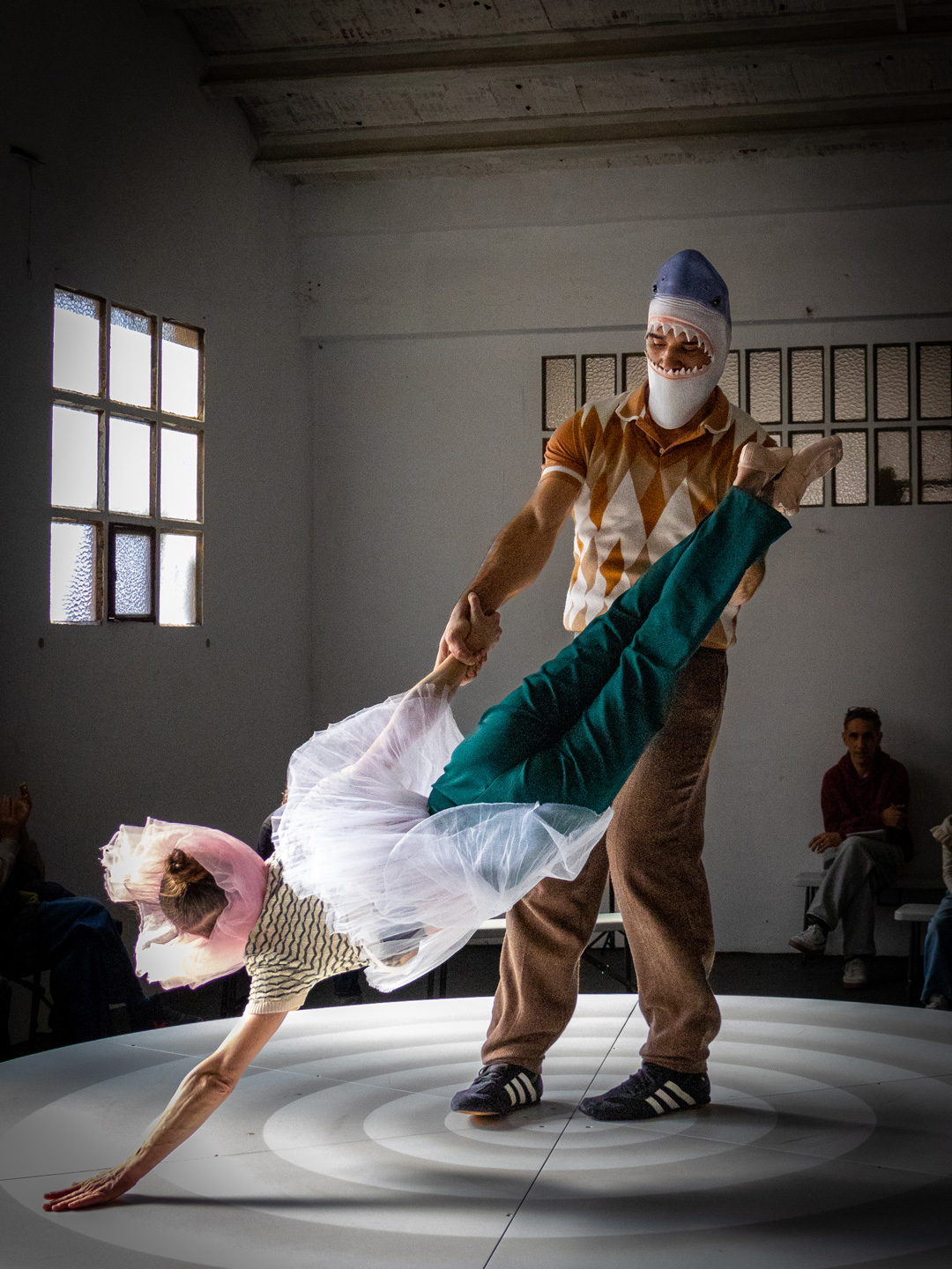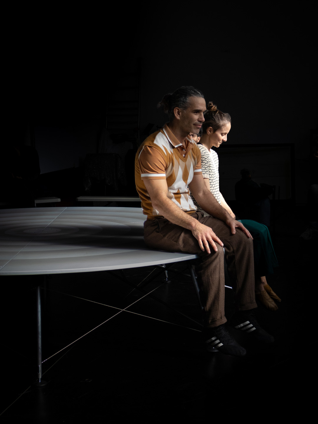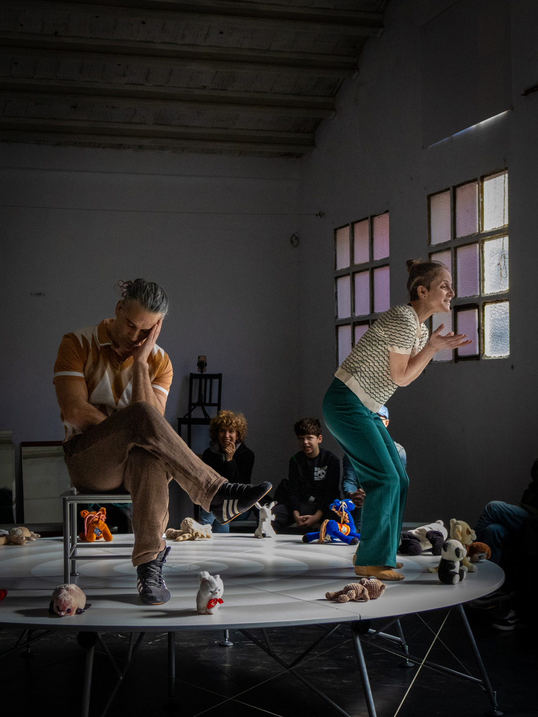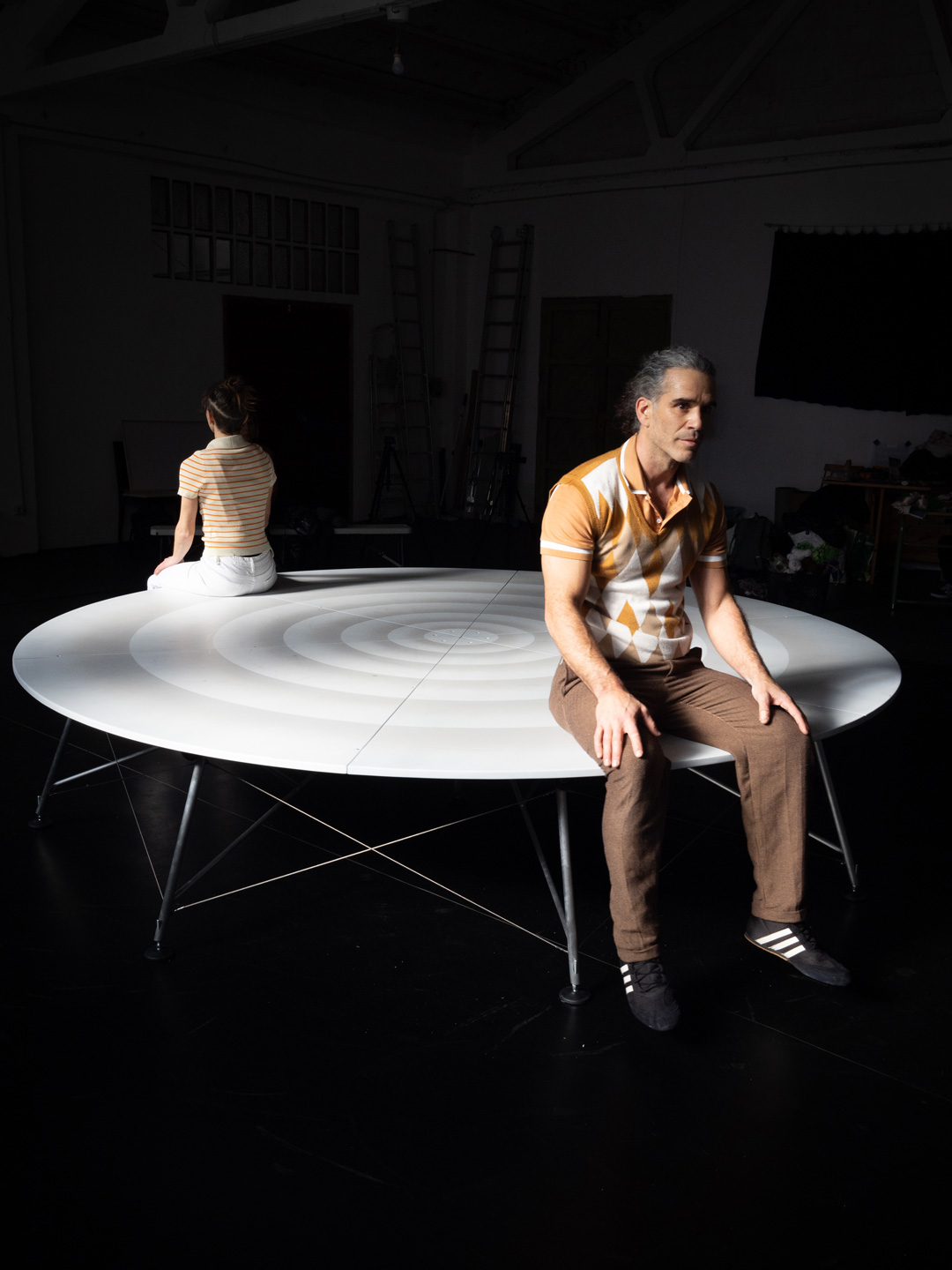 A rotating platform, conceived as a scenic space, is the setting from which we share our experiences in their various dimensions: the professional couple (as acrobats and artists), conjugal life, and the family environment. With the audience positioned in 360º, spectators become intimate witnesses to our story, narrated through our eldest daughter’s voice and her unique perspective on what it means to be part of this family.